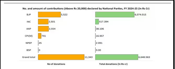 A report by Association for Democratic Reforms analysing donations above ₹20,000 declared to the Election Commission of India highlights trends in political funding and accountability.